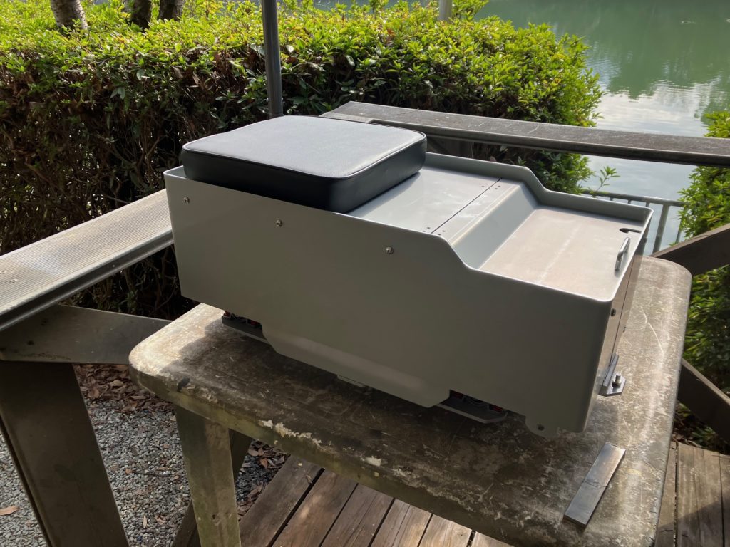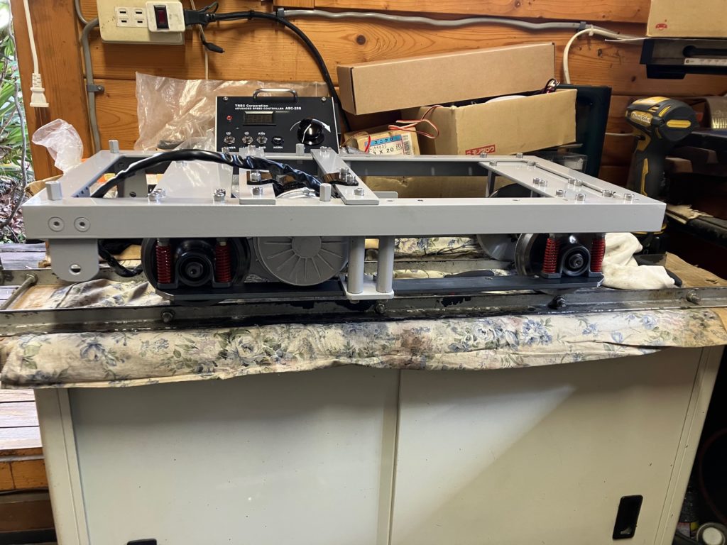 シャーシの大きさは長さ600㎜ 幅は300㎜です。中に350Wモーターをひとつ使って24Vで走行します。